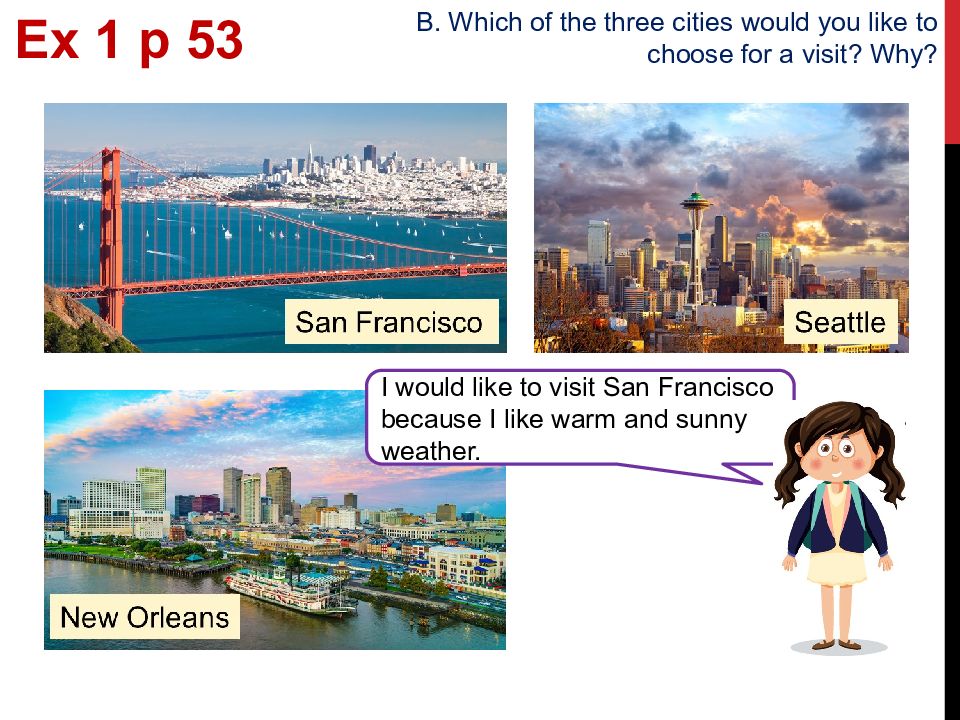 Ex 1 p 53 B. Which of the three cities would you like to choose for a visit? Why? I would like to visit San Francisco because I like warm and sunny weather.