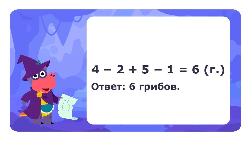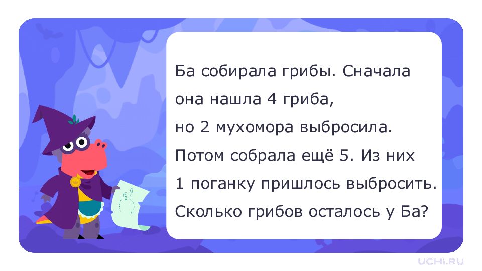 Ба собирала грибы. Сначала она нашла 4 гриба, но 2 мухомора выбросила. Потом собрала ещё 5. Из них 1 поганку пришлось выбросить. Сколько грибов осталось у Ба?