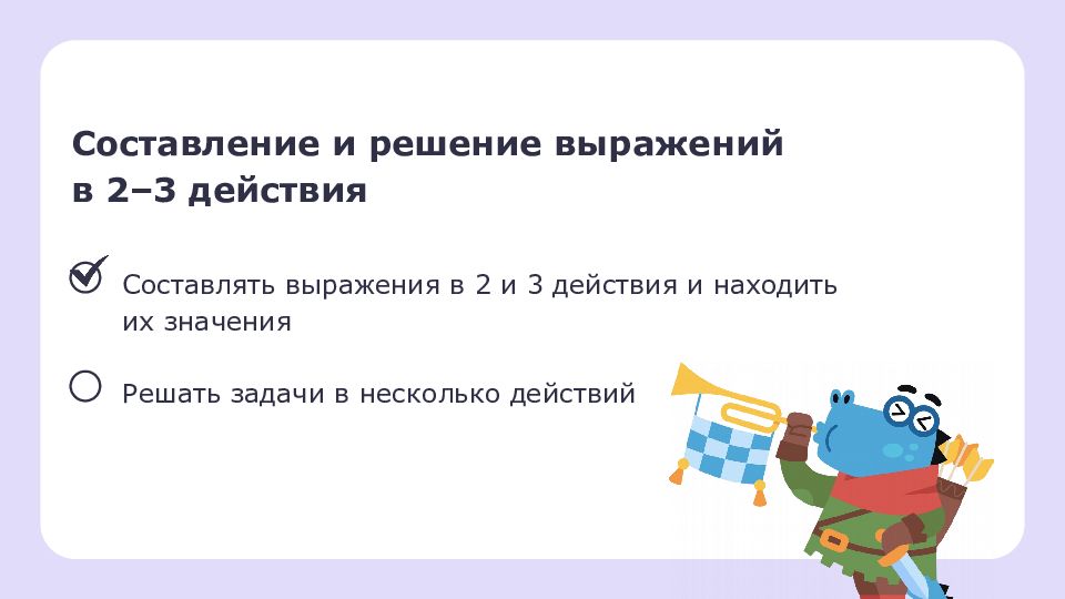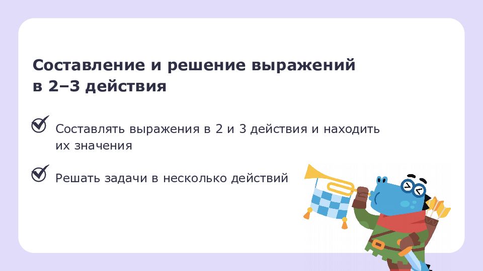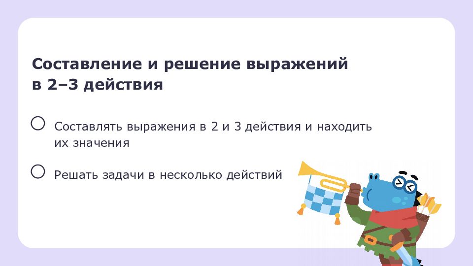 Составление и решение выражений в 2–3 действия Составлять выражения в 2 и 3 действия и находить их значения Решать задачи в несколько действий