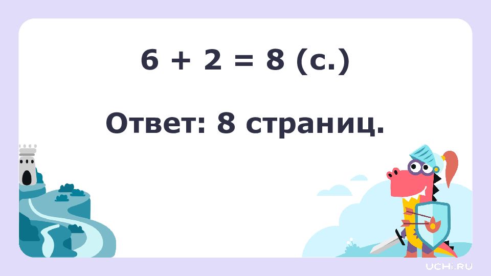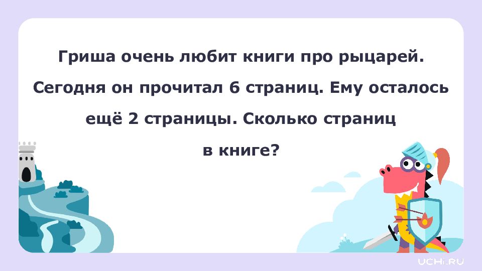 Гриша очень любит книги про рыцарей. Сегодня он прочитал 6 страниц. Ему осталось ещё 2 страницы. Сколько страниц в книге?