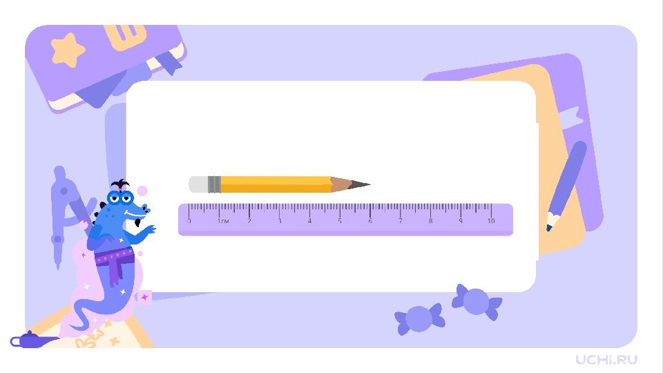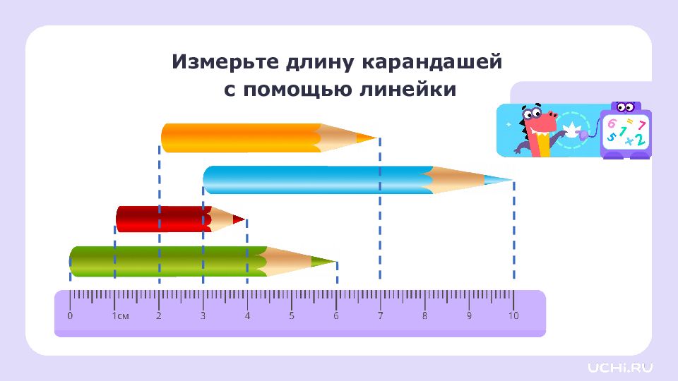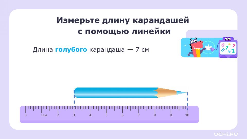 Измерьте длину карандашей с помощью линейки Длина голубого карандаша — 7 см