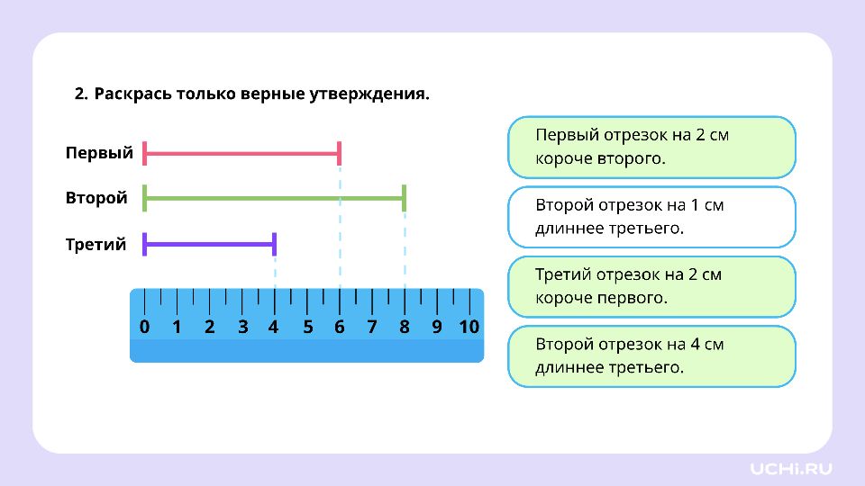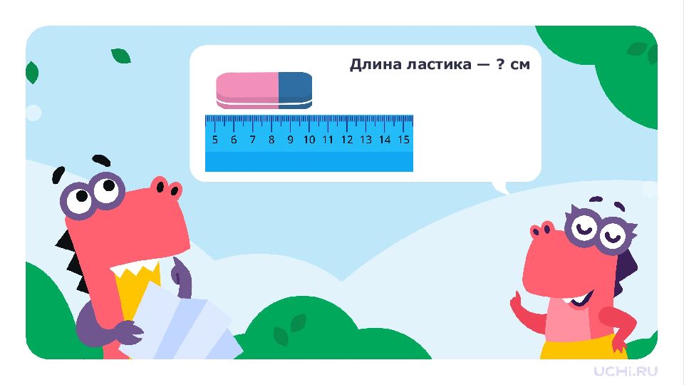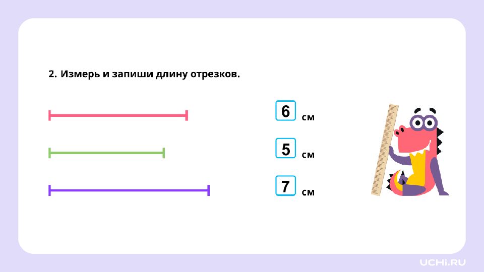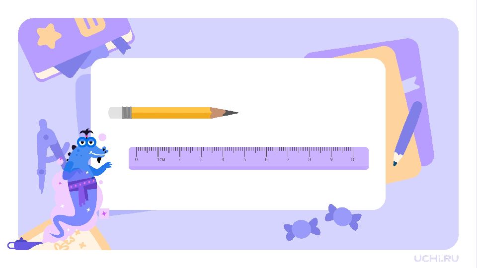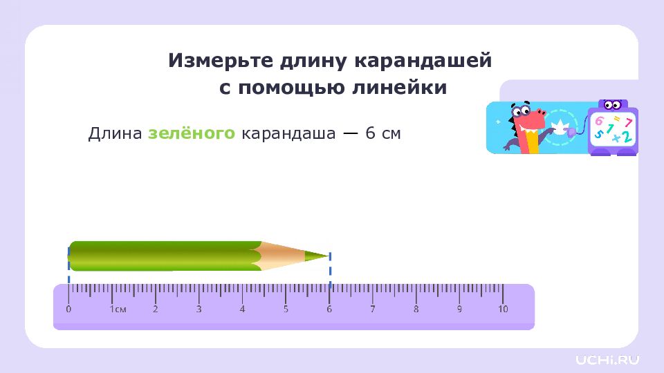 Измерьте длину карандашей с помощью линейки Длина зелёного карандаша — 6 см