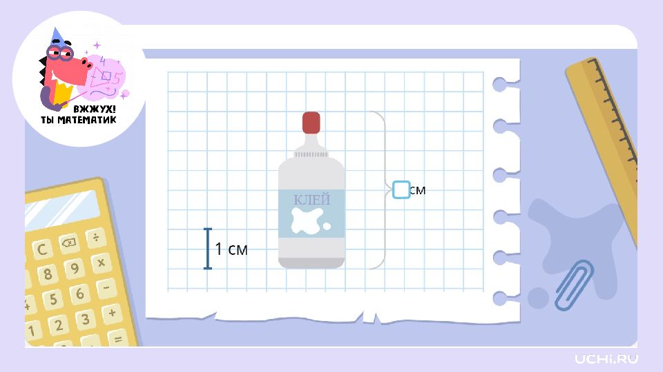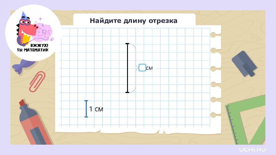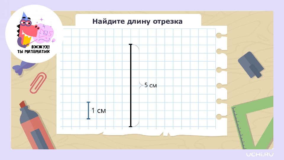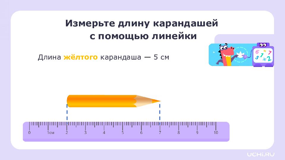 Измерьте длину карандашей с помощью линейки Длина жёлтого карандаша — 5 см