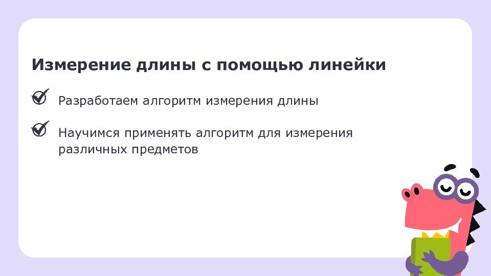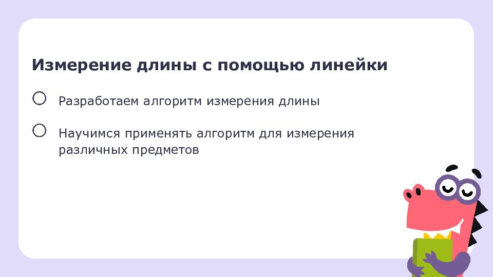 Измерение длины с помощью линейки Разработаем алгоритм измерения длины Научимся применять алгоритм для измерения различных предметов