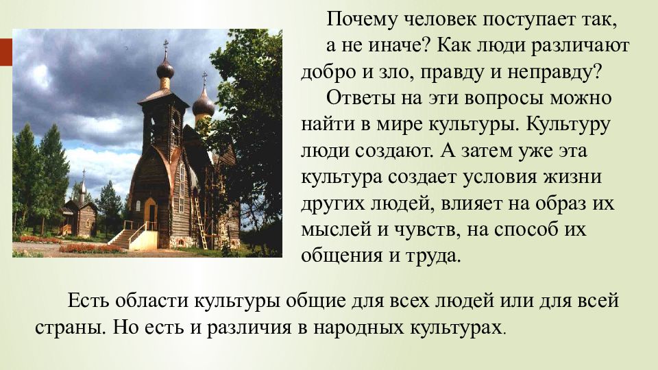 Почему человек поступает так, а не иначе? Как люди различают добро и зло, правду и неправду? Ответы на эти вопросы можно найти в мире культуры. Культуру люди создают. А затем уже эта культура создает условия жизни других людей, влияет на образ их мыслей и чувств, на способ их общения и труда. Есть области культуры общие для всех людей или для всей страны. Но есть и различия в народных культурах.
