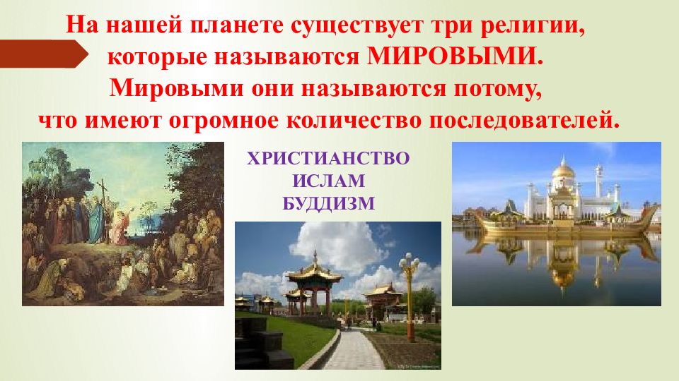 На нашей планете существует три религии, которые называются МИРОВЫМИ. Мировыми они называются потому, что имеют огромное количество последователей. ХРИСТИАНСТВО ИСЛАМ БУДДИЗМ