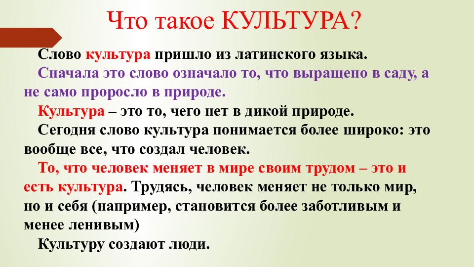 Слово культура пришло из латинского языка. Сначала это слово означало то, что выращено в саду, а не само проросло в природе. Культура – это то, чего нет в дикой природе. Сегодня слово культура понимается более широко: это вообще все, что создал человек. То, что человек меняет в мире своим трудом – это и есть культура. Трудясь, человек меняет не только мир, но и себя (например, становится более заботливым и менее ленивым) Культуру создают люди. Что такое КУЛЬТУРА?