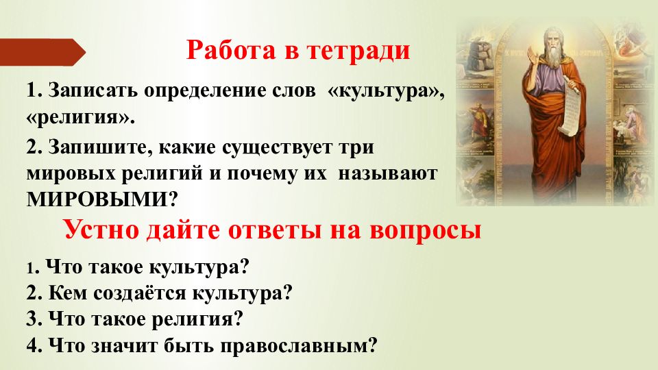 1. Записать определение слов «культура», « религия ». 2. Запишите, какие существует три мировых религий и почему их называют МИРОВЫМИ? Работа в тетради 1. Что такое культура? 2. Кем создаётся культура? 3. Что такое религия? 4. Что значит быть православным? Устно дайте ответы на вопросы