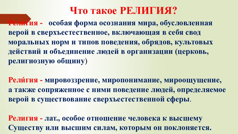 Рели́гия - особая форма осознания мира, обусловленная верой в сверхъестественное, включающая в себя свод моральных норм и типов поведения, обрядов, культовых действий и объединение людей в организации (церковь, религиозную общину ) Рели́гия - мировоззрение, миропонимание, мироощущение, а также сопряженное с ними поведение людей, определяемое верой в существование сверхъестественной сферы. Религия - лат., особое отношение человека к высшему Существу или высшим силам, которым он поклоняется. Что такое РЕЛИГИЯ?