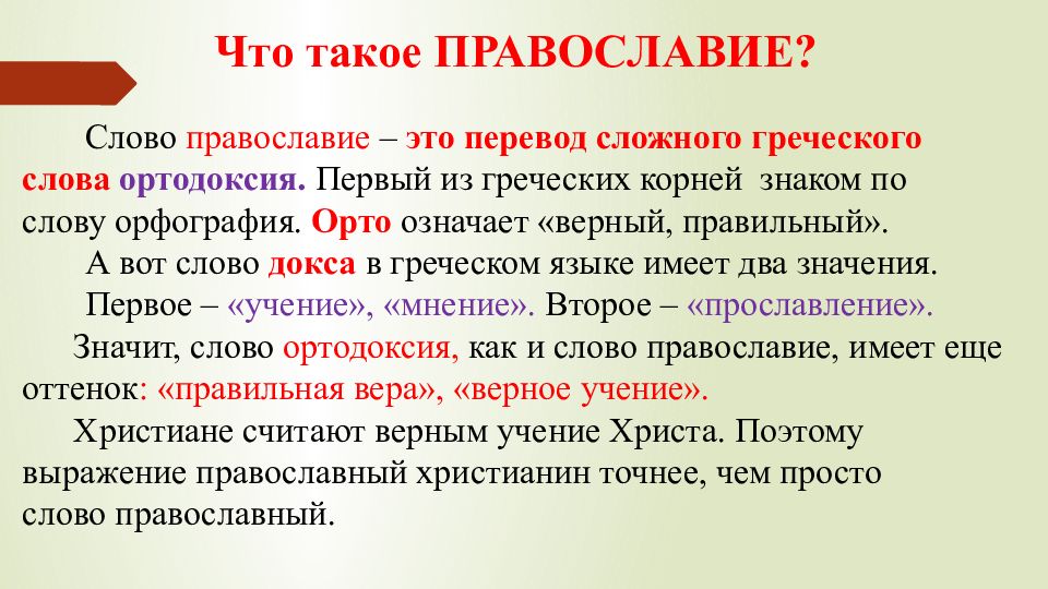 Что такое ПРАВОСЛАВИЕ? Слово православие – это перевод сложного греческого слова ортодоксия. Первый из греческих корней знаком по слову орфография. Орто означает «верный, правильный». А вот слово докса в греческом языке имеет два значения. Первое – «учение», «мнение». Второе – «прославление». Значит, слово ортодоксия, как и слово православие, имеет еще оттенок : «правильная вера», «верное учение». Христиане считают верным учение Христа. Поэтому выражение православный христианин точнее, чем просто слово православный.