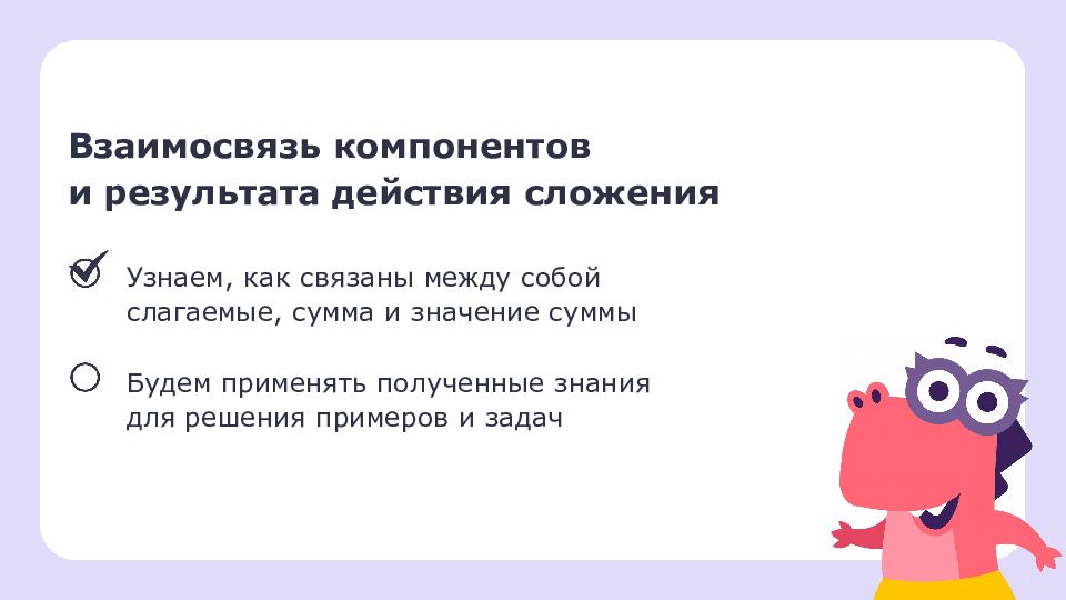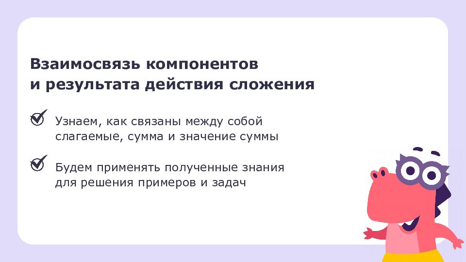 Взаимосвязь компонентов и результата действия сложения Узнаем, как связаны между собой слагаемые, сумма и значение суммы Будем применять полученные знания для решения примеров и задач