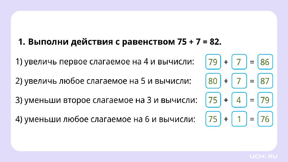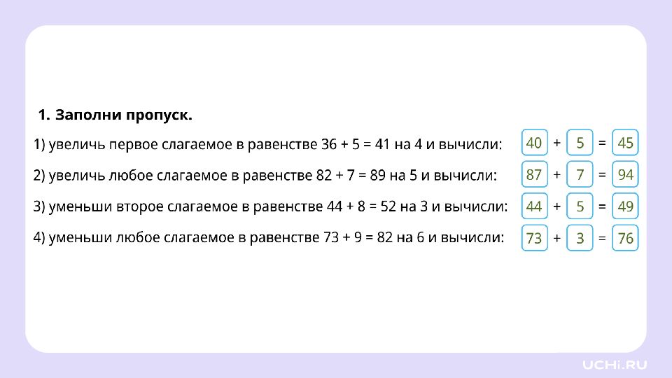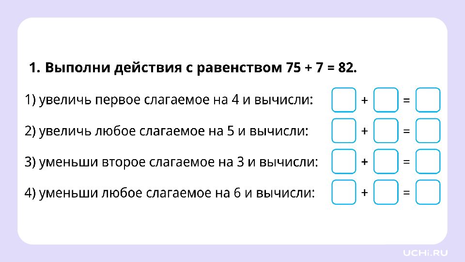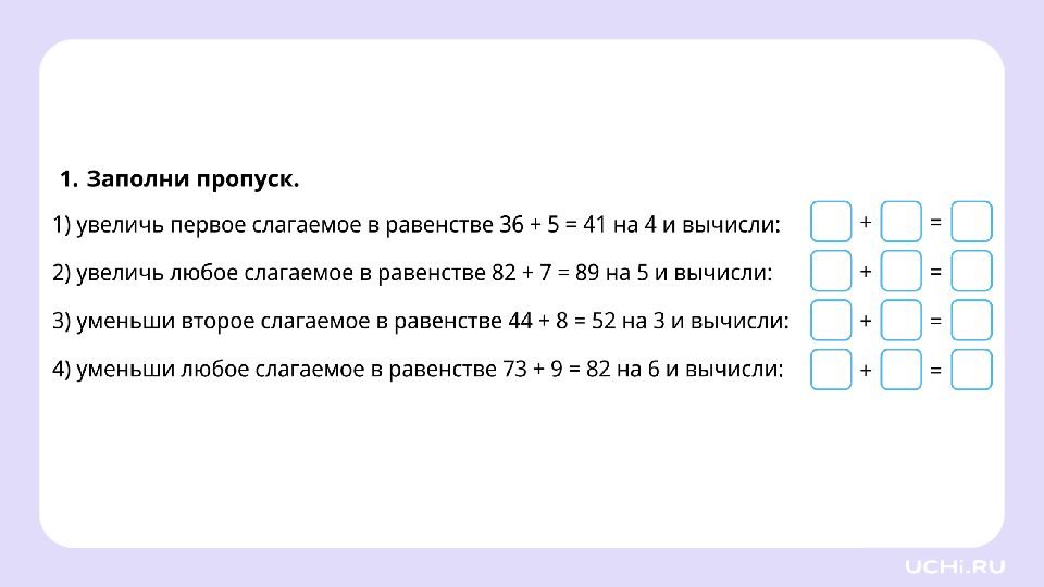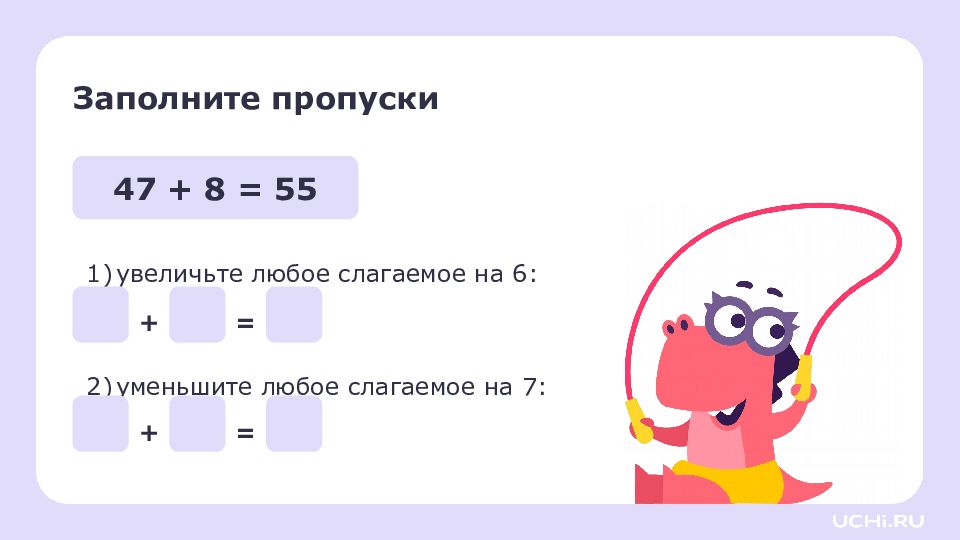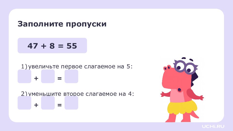 Заполните пропуски увеличьте первое слагаемое на 5: уменьшите второе слагаемое на 4: 47 + 8 = 55 + = + =