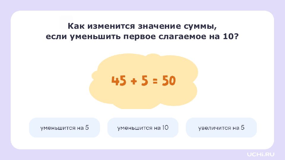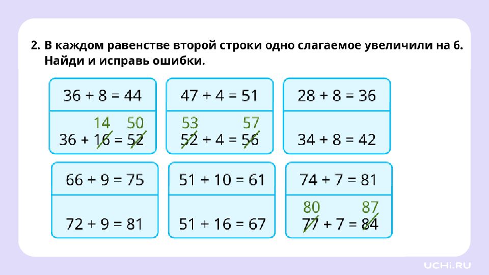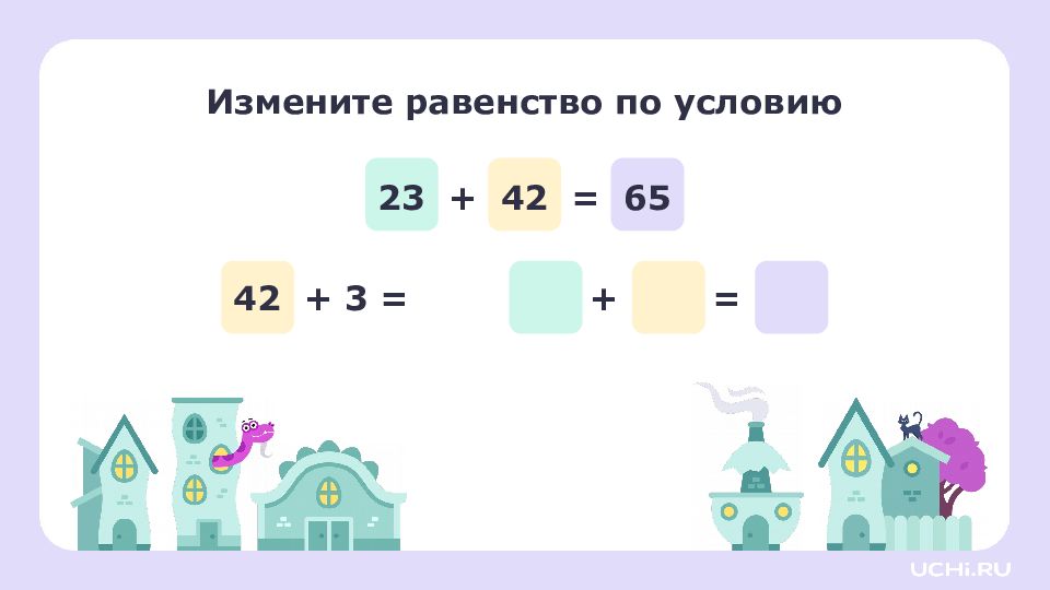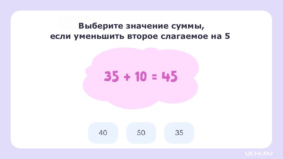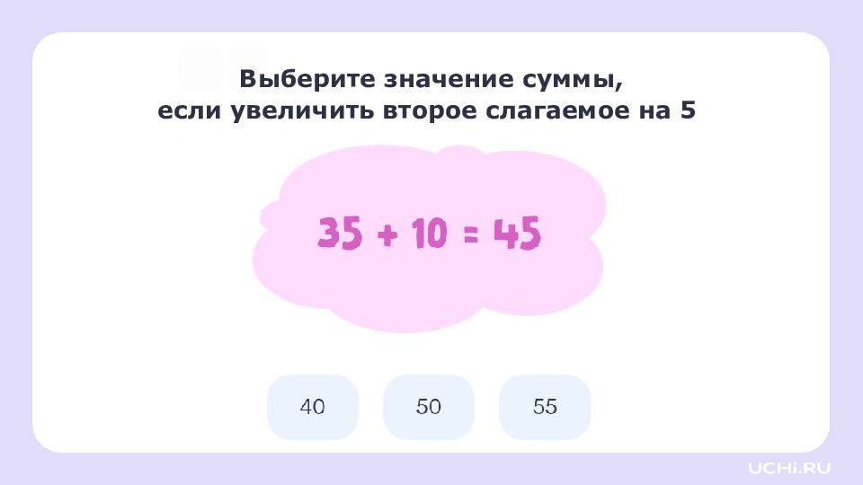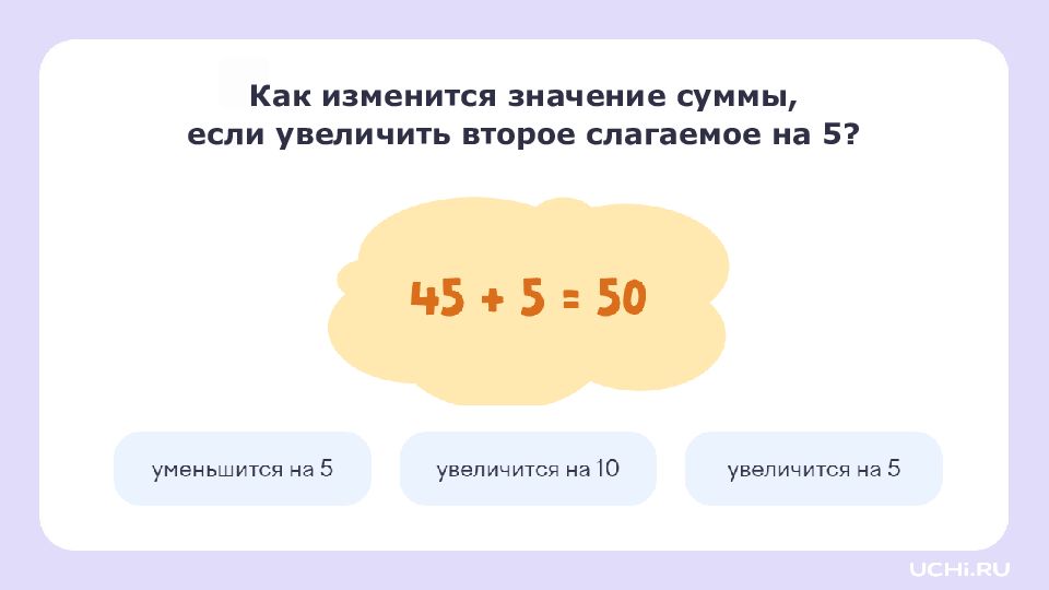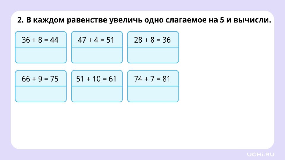 Заполните пропуски увеличьте первое слагаемое на 5: уменьшите второе слагаемое на 4: 47 + 8 = 55 + = + =