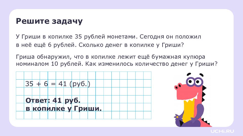 Решите задачу У Гриши в копилке 35 рублей монетами. Сегодня он положил в неё ещё 6 рублей. Сколько денег в копилке у Гриши? Гриша обнаружил, что в копилке лежит ещё бумажная купюра номиналом 10 руб лей. Как изменилось количество денег у Гриши? 35 + 6 = 41 (руб.) Ответ: 41 руб. в копилке у Гриши.