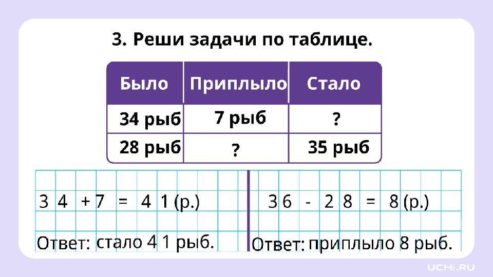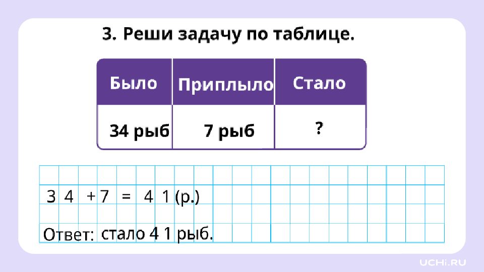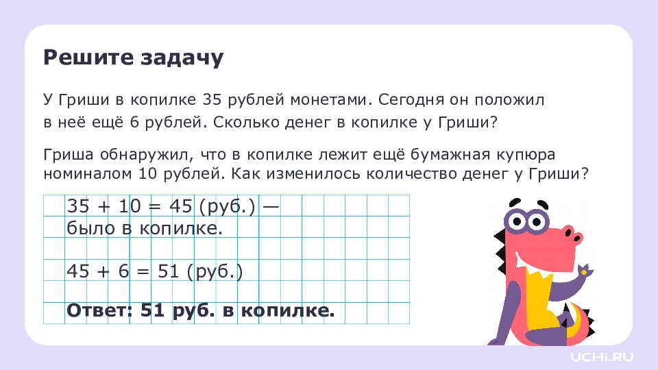 Решите задачу У Гриши в копилке 35 рублей монетами. Сегодня он положил в неё ещё 6 рублей. Сколько денег в копилке у Гриши? Гриша обнаружил, что в копилке лежит ещё бумажная купюра номиналом 10 руб лей. Как изменилось количество денег у Гриши? 35 + 10 = 45 (руб.) — было в копилке. Ответ: 51 руб. в копилке. 45 + 6 = 51 (руб.)