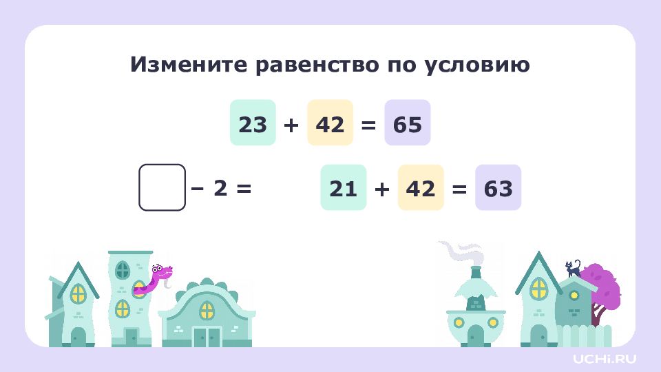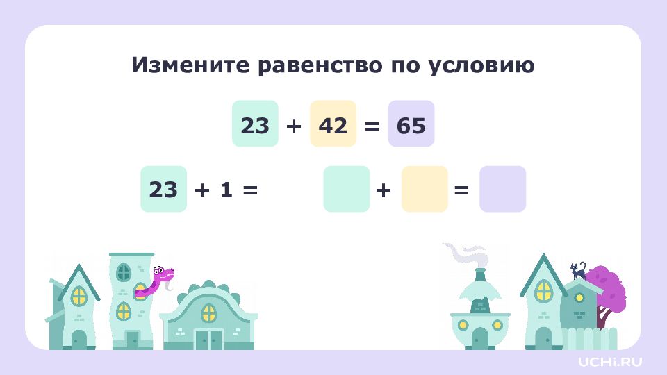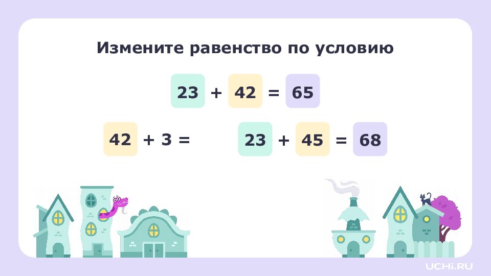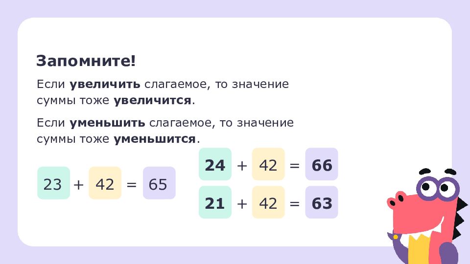 Если увеличить слагаемое, то значение суммы тоже увеличится. Если уменьшить слагаемое, то значение суммы тоже уменьшит ся. Запомните ! 23 + 42 = 65 24 + 42 = 66 21 + 42 = 63