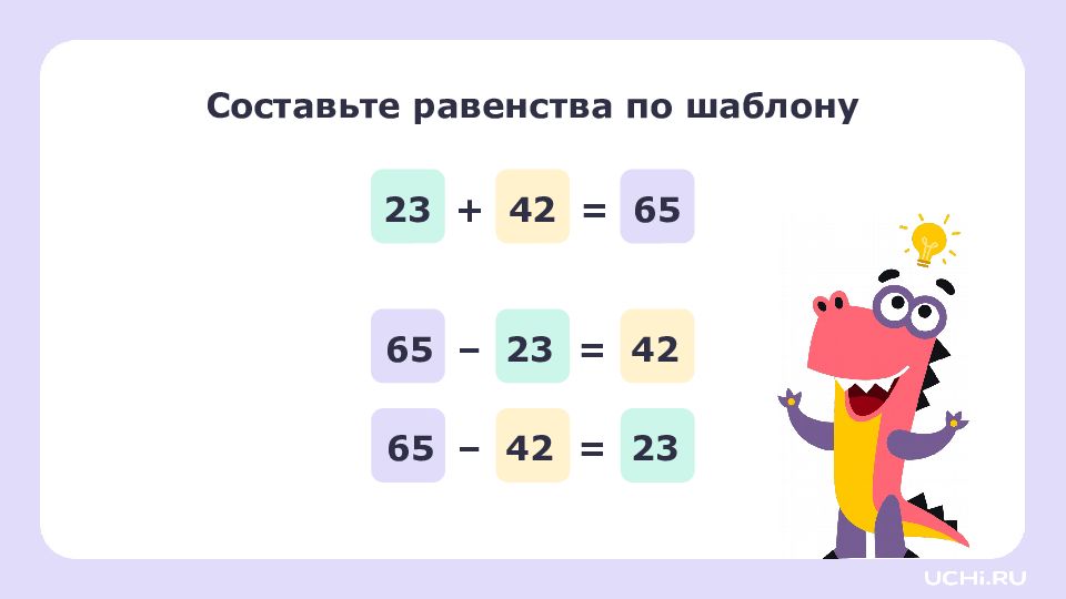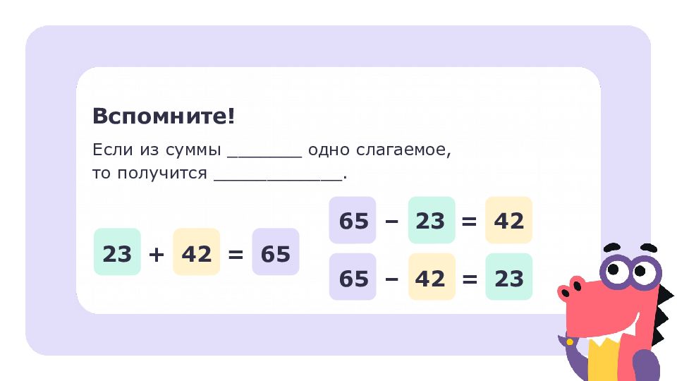 Если из суммы _______ одно слагаемое, то получится ___________ _. Вспомните! 23 + 42 = 65 65 – 23 = 42 65 – 42 = 23