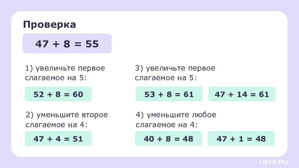 1) увеличьте первое слагаемое на 5 : 47 + 8 = 55 2) уменьшите второе слагаемое на 4: Проверка 3) увеличьте первое слагаемое на 5 : 4) уменьшите любое слагаемое на 4: 52 + 8 = 60 47 + 4 = 51 40 + 8 = 48 47 + 1 = 48 53 + 8 = 61 47 + 14 = 61