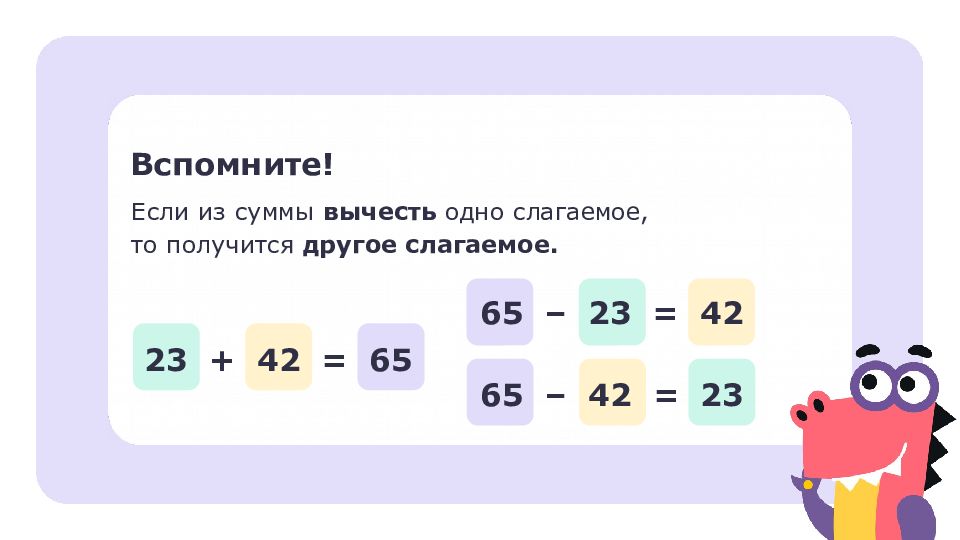 Если из суммы вычесть одно слагаемое, то получится другое слагаемое. Вспомните! 23 + 42 = 65 65 – 23 = 42 65 – 42 = 23