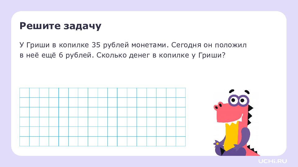 Решите задачу У Гриши в копилке 35 рублей монетами. Сегодня он положил в неё ещё 6 рублей. Сколько денег в копилке у Гриши?