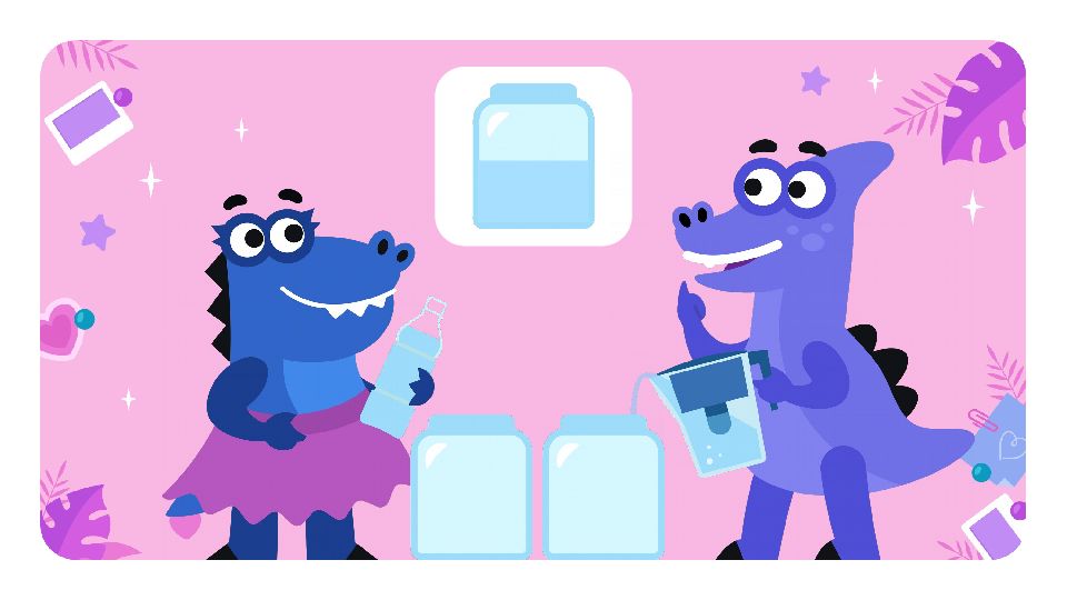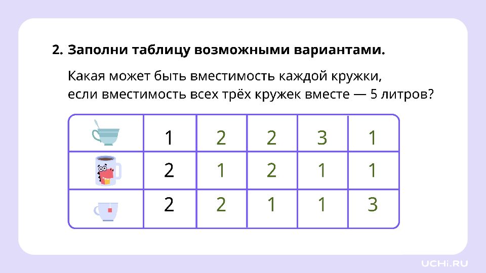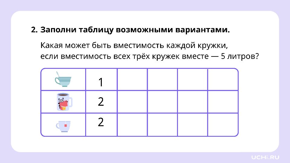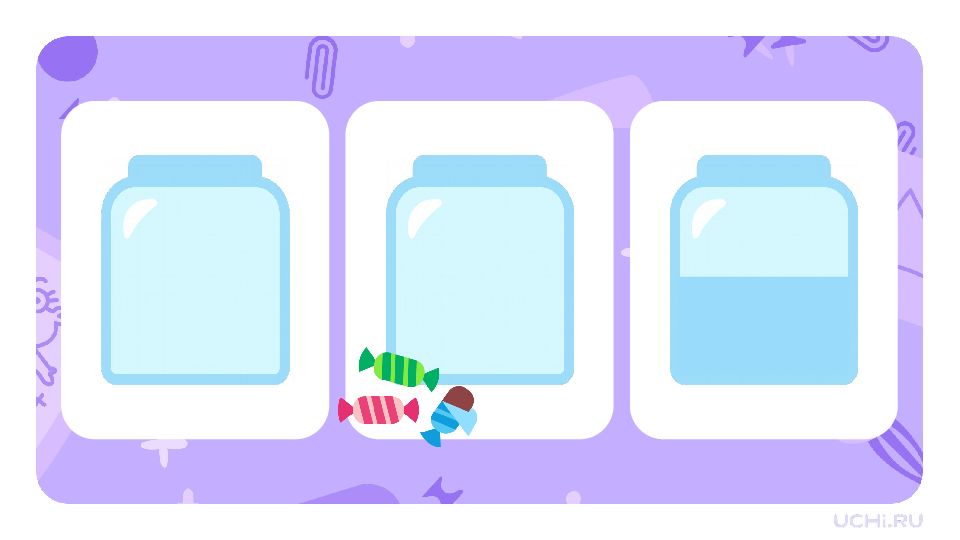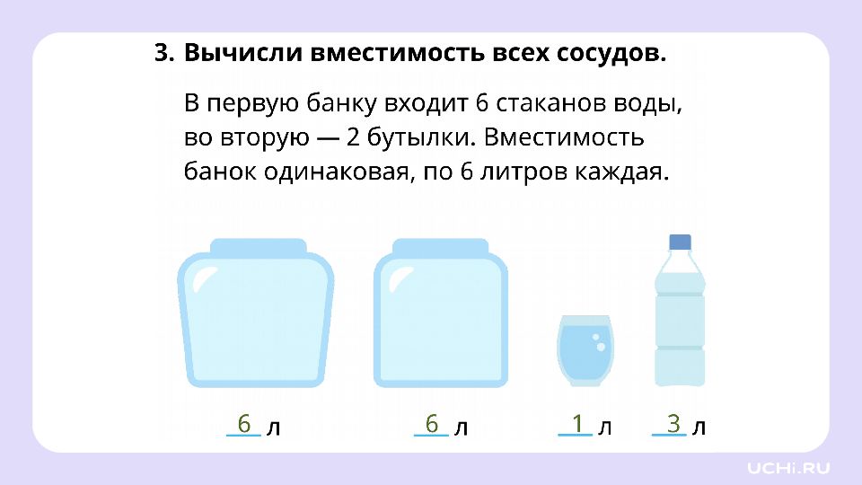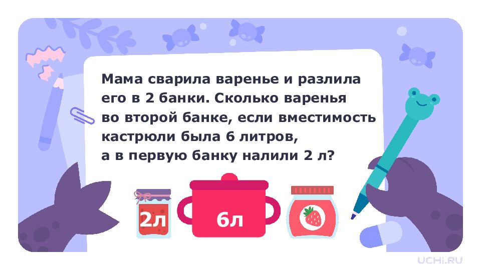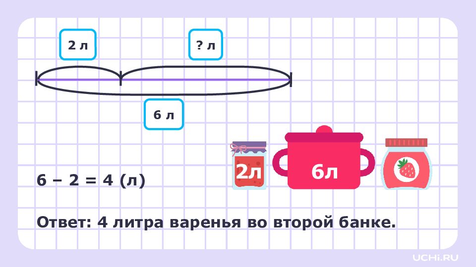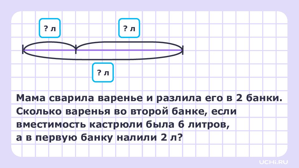 Мама сварила варенье и разлила его в 2 банки. Сколько варенья во второй банке, если вместимость кастрюли была 6 литров, а в первую банку налили 2 л? ? л ? л ? л