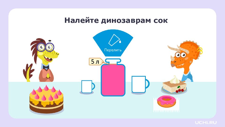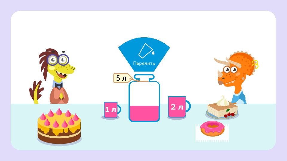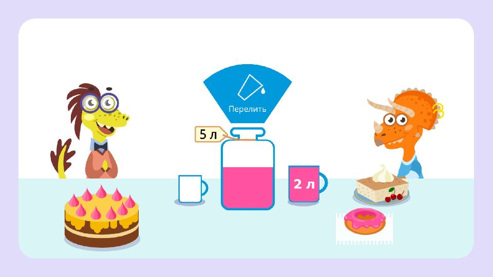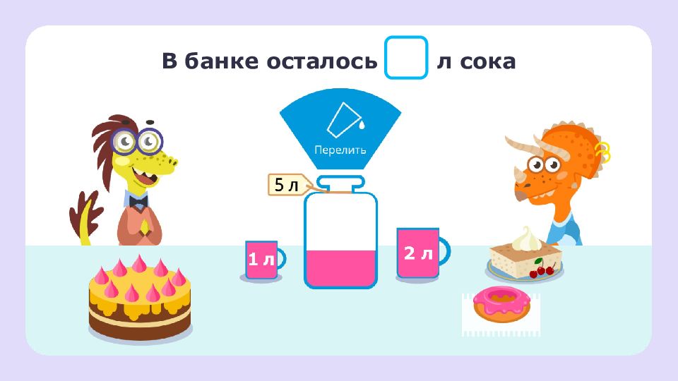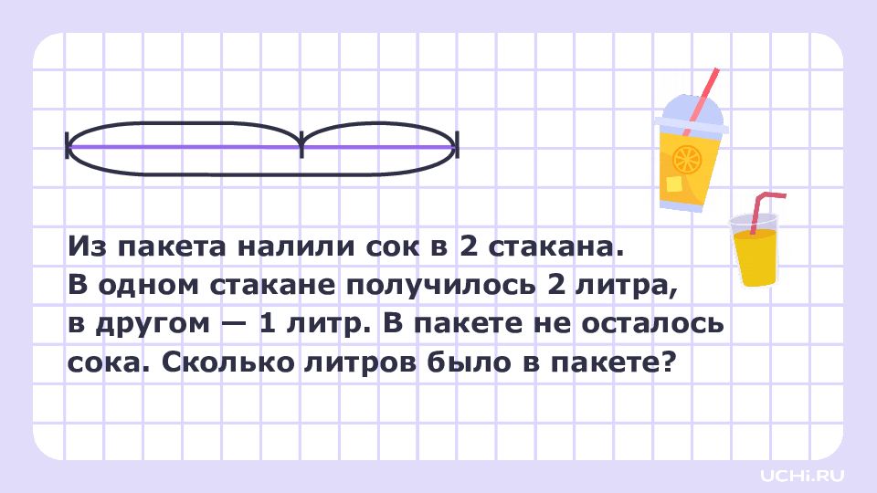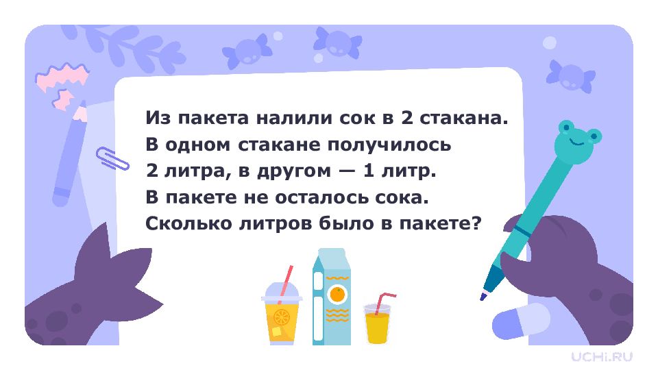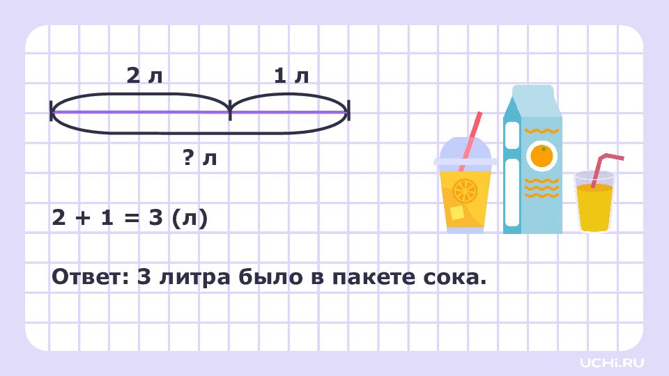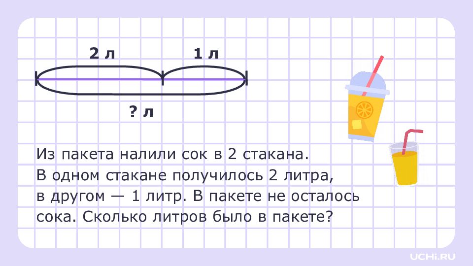 Из пакета налили сок в 2 стакана. В одном стакане получилось 2 литра, в другом — 1 литр. В пакете не осталось сока. Сколько литров было в пакете? 2 л 1 л ? л