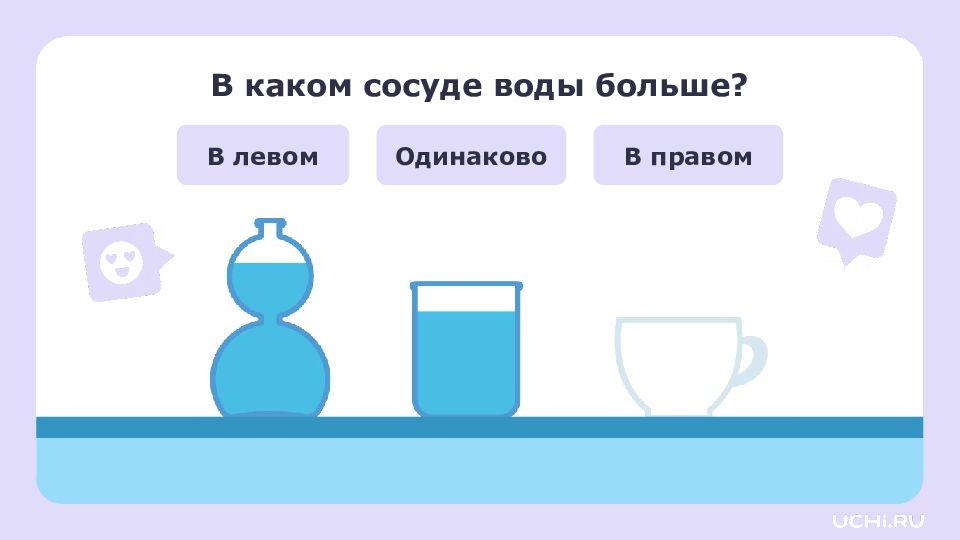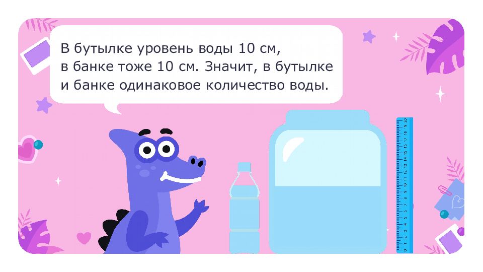 В бутылке уровень воды 10 см, в банке тоже 10 см. Значит, в бутылке и банке одинаковое количество воды.