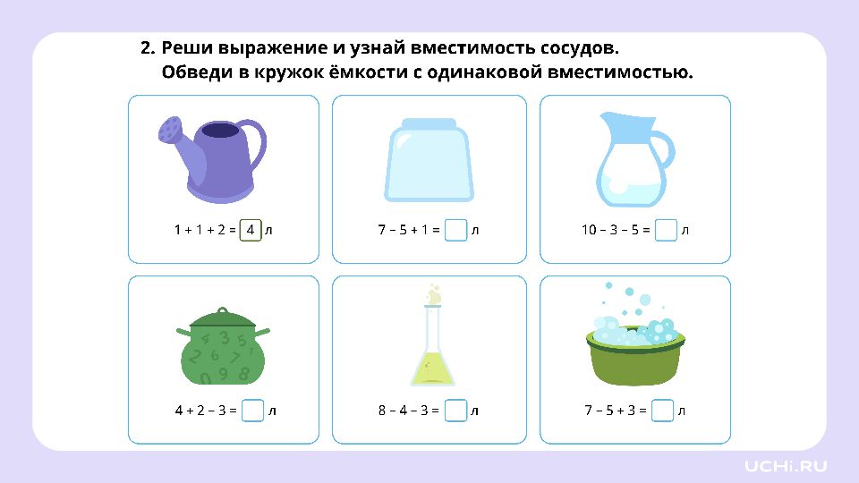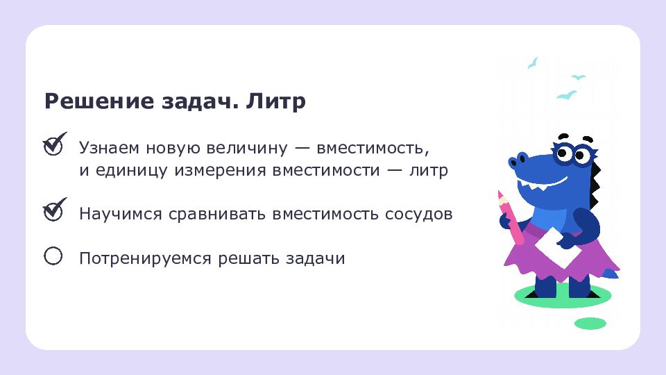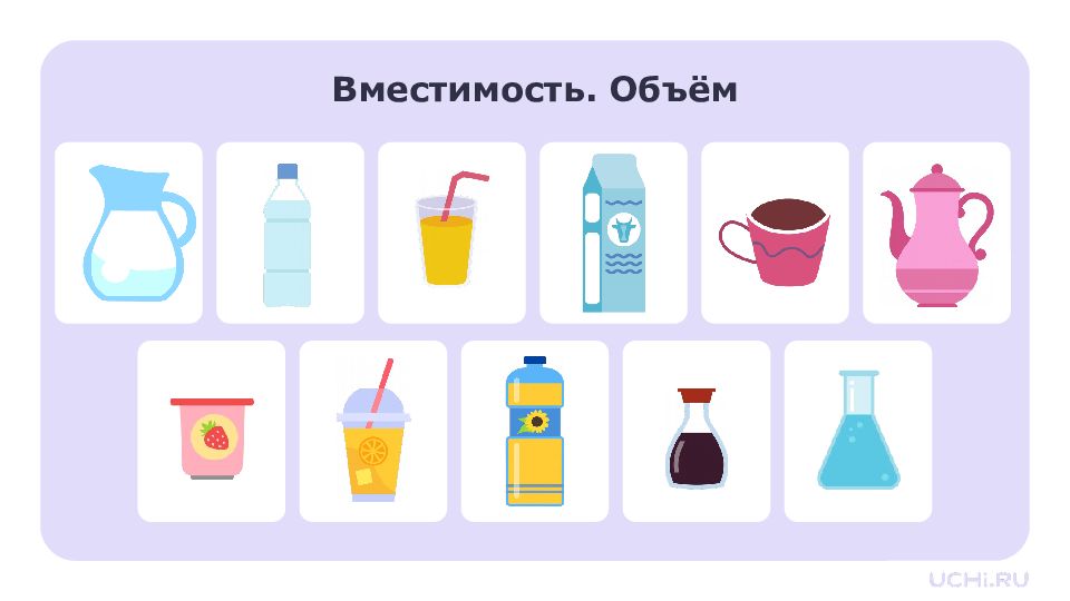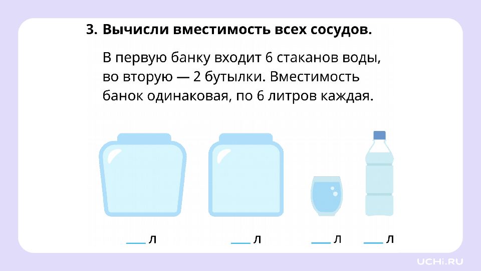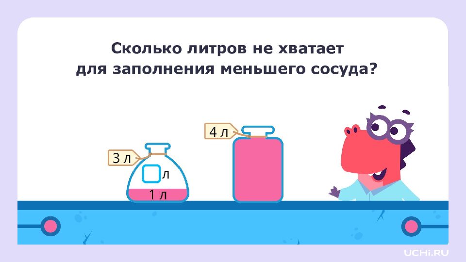Решение задач. Литр Узнаем новую величину — вместимость, и единицу измерения вместимости — литр Научимся сравнивать вместимость сосудов Потренируемся решать задачи