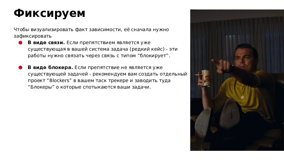 В виде связи. Если препятствием является уже существующая в вашей система задача (редкий кейс) - эти работы нужно связать через связь с типом “блокирует”. В виде блокера. Если препятствие не является уже существующей задачей - рекомендуем вам создать отдельный проект “Blockers” в вашем таск трекере и заводить туда “Блокеры” о которые спотыкаются ваши задачи. Чтобы визуализировать факт зависимости, её сначала нужно зафиксировать