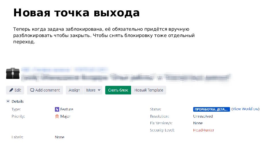 Теперь когда задача заблокирована, её обязательно придётся вручную разблокировать чтобы закрыть. Чтобы снять блокировку тоже отдельный переход.
