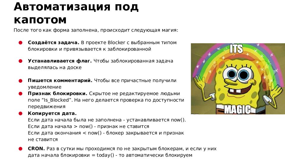 После того как форма заполнена, происходит следующая магия: Создаётся задача. В проекте Blocker c выбранным типом блокировки и привязывается к заблокированной Устанавливается флаг. Чтобы заблокированная задача выделялась на доске Пишется комментарий. Чтобы все причастные получили уведомление Признак блокировки. Скрытое не редактируемое людьми поле “Is_Blocked”. На него делается проверка по доступности передвижения Копируется дата. Если дата начала была не заполнена - устанавливается now(). Если дата начала > now() - признак не ставится Если дата окончания < now() - блокер закрывается и признак не ставится CRON. Раз в сутки мы проходимся по не закрытым блокерам, и если у них дата начала блокировки = today() - то автоматически блокируем связанную задачу.