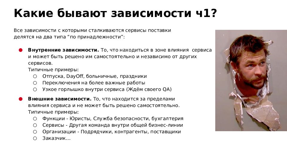 Внутренние зависимости. То, что находиться в зоне влияния сервиса и может быть решено им самостоятельно и независимо от других сервисов. Типичные примеры: Отпуска, DayOff, больничные, праздники Переключения на более важные работы Узкое горлышко внутри сервиса (Ждём своего QA) Внешние зависимости. То, что находится за пределами влияния сервиса и не может быть решено самостоятельно. Типичные примеры: Функции - Юристы, Служба безопасности, бухгалтерия Сервисы - Другая команда внутри общей бизнес-линии Организации - Подрядчики, контрагенты, поставщики Заказчик… Все зависимости с которыми сталкиваются сервисы поставки делятся на два типа “по принадлежности” :
