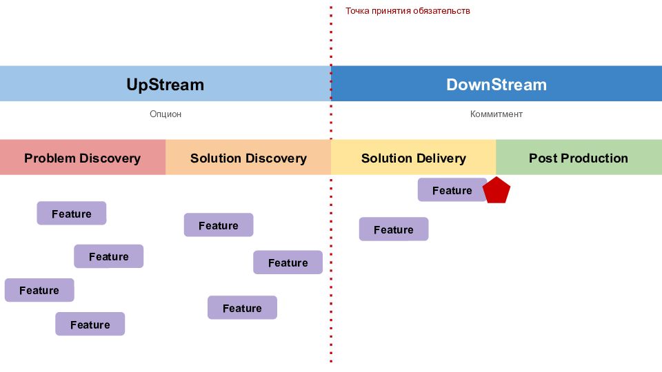UpStream DownStream Точка принятия обязательств Problem Discovery Solution Discovery Solution Delivery Post Production Опцион Коммитмент Feature Feature Feature Feature Feature Feature Feature Feature Feature