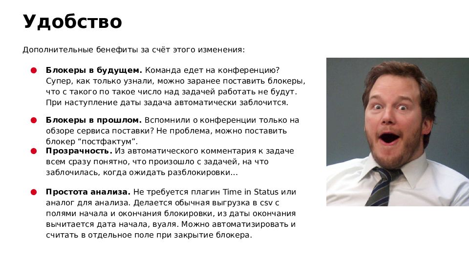 Блокеры в будущем. Команда едет на конференцию? Супер, как только узнали, можно заранее поставить блокеры, что с такого по такое число над задачей работать не будут. При наступление даты задача автоматически заблочится. Блокеры в прошлом. Вспомнили о конференции только на обзоре сервиса поставки? Не проблема, можно поставить блокер “постфактум”. Дополнительные бенефиты за счёт этого изменения: Прозрачность. Из автоматического комментария к задаче всем сразу понятно, что произошло с задачей, на что заблочилась, когда ожидать разблокировки… Простота анализа. Не требуется плагин Time in Status или аналог для анализа. Делается обычная выгрузка в csv с полями начала и окончания блокировки, из даты окончания вычитается дата начала, вуаля. Можно автоматизировать и считать в отдельное поле при закрытие блокера.