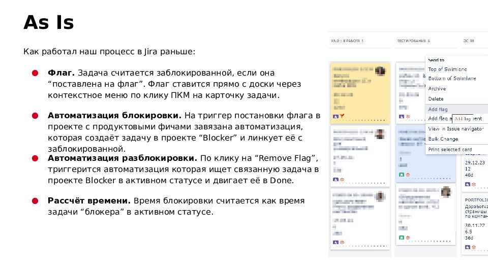 Флаг. Задача считается заблокированной, если она “поставлена на флаг”. Флаг ставится прямо с доски через контекстное меню по клику ПКМ на карточку задачи. Автоматизация блокировки. На триггер постановки флага в проекте с продуктовыми фичами завязана автоматизация, которая создаёт задачу в проекте “Blocker” и линкует её с заблокированной. Как работал наш процесс в Jira раньше: Автоматизация разблокировки. По клику на “Remove Flag”, триггерится автоматизация которая ищет связанную задача в проекте Blocker в активном статусе и двигает её в Done. Рассчёт времени. Время блокировки считается как время задачи “блокера” в активном статусе.