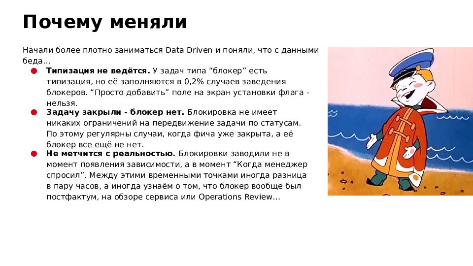 Типизация не ведётся. У задач типа “блокер” есть типизация, но её заполняются в 0,2% случаев заведения блокеров. “Просто добавить” поле на экран установки флага - нельзя. Задачу закрыли - блокер нет. Блокировка не имеет никаких ограничений на передвижение задачи по статусам. По этому регулярны случаи, когда фича уже закрыта, а её блокер все ещё не нет. Начали более плотно заниматься Data Driven и поняли, что с данными беда… Не метчится с реальностью. Блокировки заводили не в момент появления зависимости, а в момент “Когда менеджер спросил”. Между этими временными точками иногда разница в пару часов, а иногда узнаём о том, что блокер вообще был постфактум, на обзоре сервиса или Operations Review…