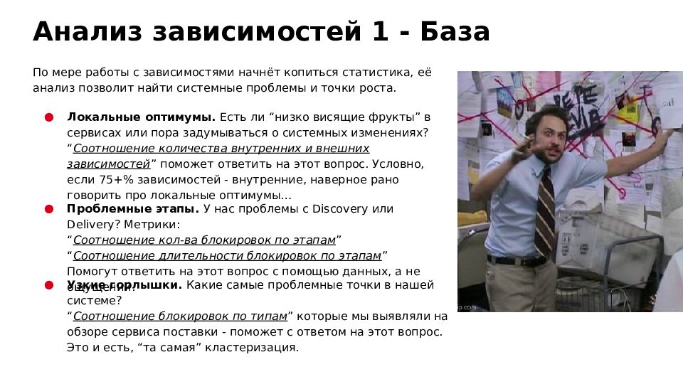 Локальные оптимумы. Есть ли “низко висящие фрукты” в сервисах или пора задумываться о системных изменениях? “ Соотношение количества внутренних и внешних зависимостей ” поможет ответить на этот вопрос. Условно, если 75+% зависимостей - внутренние, наверное рано говорить про локальные оптимумы… Проблемные этапы. У нас проблемы с Discovery или Delivery? Метрики: “ Соотношение кол-ва блокировок по этапам ” “ Соотношение длительности блокировок по этапам ” Помогут ответить на этот вопрос с помощью данных, а не ощущений. По мере работы с зависимостями начнёт копиться статистика, её анализ позволит найти системные проблемы и точки роста. Узкие горлышки. Какие самые проблемные точки в нашей системе? “ Соотношение блокировок по типам ” которые мы выявляли на обзоре сервиса поставки - поможет с ответом на этот вопрос. Это и есть, “та самая” кластеризация.