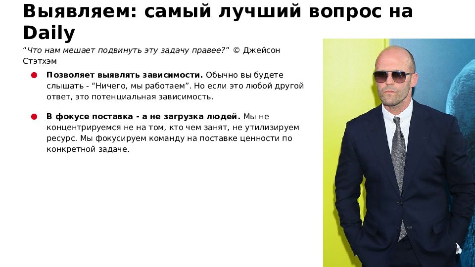 Позволяет выявлять зависимости. Обычно вы будете слышать - “Ничего, мы работаем”. Но если это любой другой ответ, это потенциальная зависимость. В фокусе поставка - а не загрузка людей. Мы не концентрируемся не на том, кто чем занят, не утилизируем ресурс. Мы фокусируем команду на поставке ценности по конкретной задаче. “ Что нам мешает подвинуть эту задачу правее? ” © Джейсон Стэтхэм