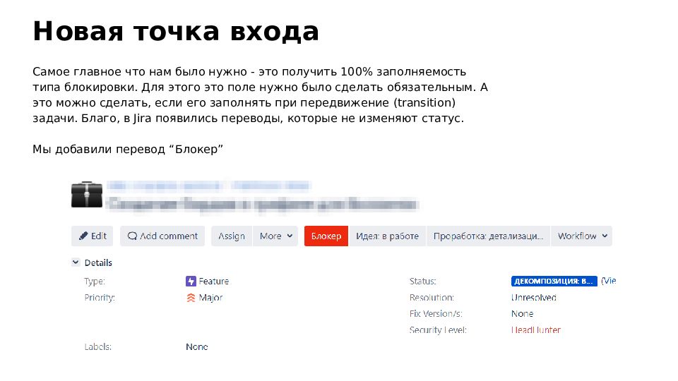 Самое главное что нам было нужно - это получить 100% заполняемость типа блокировки. Для этого это поле нужно было сделать обязательным. А это можно сделать, если его заполнять при передвижение (transition) задачи. Благо, в Jira появились переводы, которые не изменяют статус. Мы добавили перевод “Блокер”