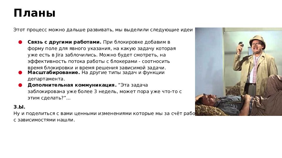 Этот процесс можно дальше развивать, мы выделили следующие идеи Связь с другими работами. При блокировке добавим в форму поле для явного указания, на какую задачу которая уже есть в Jira заблочились. Можно будет смотреть, на эффективность потока работы с блокерами - соотносить время блокировки и время решения зависимой задачи. Масштабирование. На другие типы задач и функции департамента. Дополнительная коммуникация. “Эта задача заблокирована уже более 3 недель, может пора уже что-то с этим сделать?”... З.Ы. Ну и поделиться с вами ценными изменениями которые мы за счёт работы с зависимостями нашли.