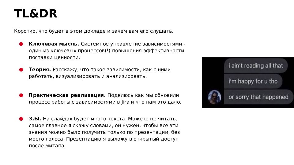 Ключевая мысль. Системное управление зависимостями - один из ключевых процессов(!) повышения эффективности поставки ценности. Теория. Расскажу, что такое зависимости, как с ними работать, визуализировать и анализировать. Коротко, что будет в этом докладе и зачем вам его слушать. Практическая реализация. Поделюсь как мы обновили процесс работы с зависимостями в Jira и что нам это дало. З.Ы. На слайдах будет много текста. Можете не читать, самое главное я скажу словами, он нужен, чтобы все эти знания можно было получить только по презентации, без моего голоса. Презентацию я выложу в открытый доступ после митапа.