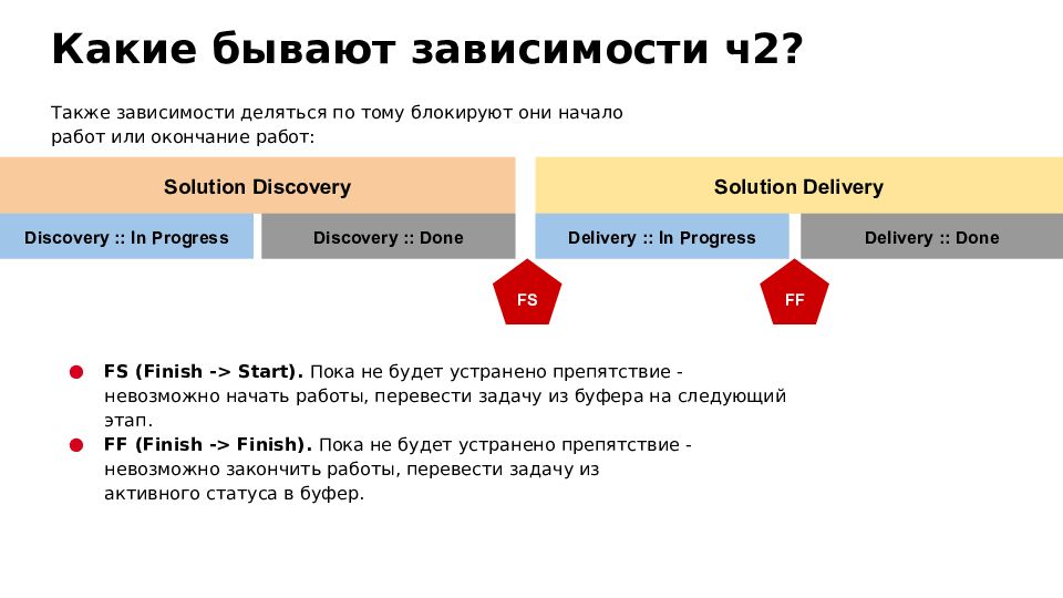 FS (Finish -> Start). Пока не будет устранено препятствие - невозможно начать работы, перевести задачу из буфера на следующий этап. FF (Finish -> Finish). Пока не будет устранено препятствие - невозможно закончить работы, перевести задачу из активного статуса в буфер. Также зависимости деляться по тому блокируют они начало работ или окончание работ : Solution Delivery Solution Discovery Discovery :: In Progress Discovery :: Done Delivery :: In Progress Delivery :: Done FS FF