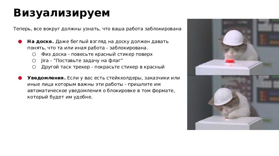 На доске. Даже беглый взгляд на доску должен давать понять, что та или иная работа - заблокирована. Физ доска - повесьте красный стикер поверх Jira - “Поставьте задачу на флаг” Другой таск трекер - покрасьте стикер в красный Уведомления. Если у вас есть стейкхолдеры, заказчики или иные лица которым важны эти работы - пришлите им автоматическое уведомления о блокировке в том формате, который будет им удобне. Теперь, все вокруг должны узнать, что ваша работа заблокирована