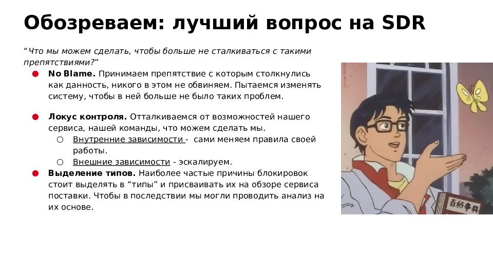 No Blame. Принимаем препятствие с которым столкнулись как данность, никого в этом не обвиняем. Пытаемся изменять систему, чтобы в ней больше не было таких проблем. Локус контроля. Отталкиваемся от возможностей нашего сервиса, нашей команды, что можем сделать мы. Внутренние зависимости - сами меняем правила своей работы. Внешние зависимости - эскалируем. “ Что мы можем сделать, чтобы больше не сталкиваться с такими препятствиями? ” Выделение типов. Наиболее частые причины блокировок стоит выделять в “типы” и присваивать их на обзоре сервиса поставки. Чтобы в последствии мы могли проводить анализ на их основе.