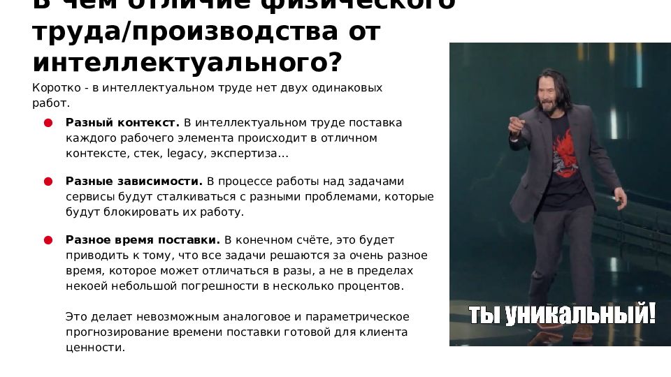 Разный контекст. В интеллектуальном труде поставка каждого рабочего элемента происходит в отличном контексте, стек, legacy, экспертиза… Разные зависимости. В процессе работы над задачами сервисы будут сталкиваться с разными проблемами, которые будут блокировать их работу. Коротко - в интеллектуальном труде нет двух одинаковых работ. Разное время поставки. В конечном счёте, это будет приводить к тому, что все задачи решаются за очень разное время, которое может отличаться в разы, а не в пределах некоей небольшой погрешности в несколько процентов. Это делает невозможным аналоговое и параметрическое прогнозирование времени поставки готовой для клиента ценности.