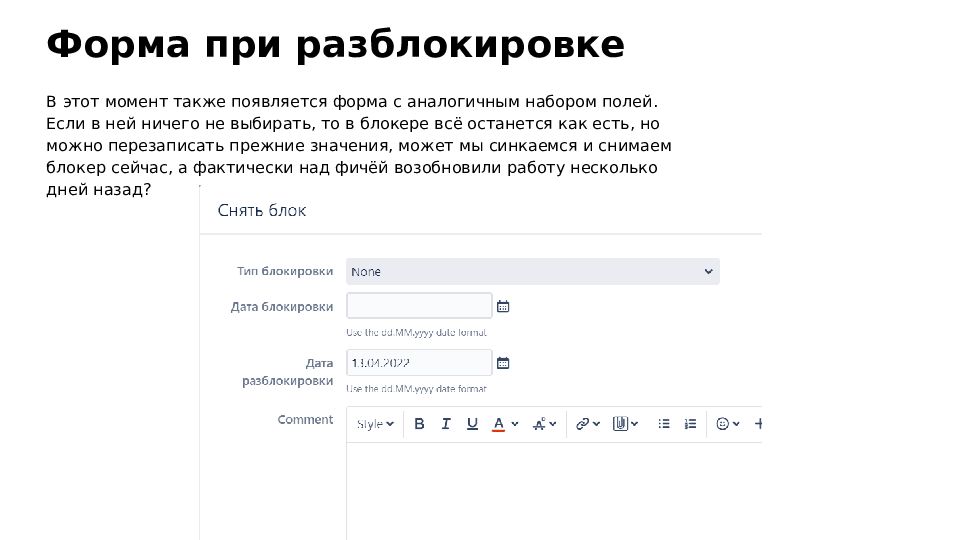 В этот момент также появляется форма с аналогичным набором полей. Если в ней ничего не выбирать, то в блокере всё останется как есть, но можно перезаписать прежние значения, может мы синкаемся и снимаем блокер сейчас, а фактически над фичёй возобновили работу несколько дней назад?