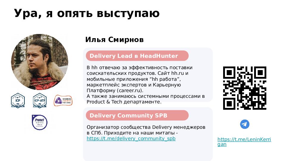 https://t.me/LeninKerrigan Илья Смирнов В hh отвечаю за эффективность поставки соискательских продуктов. Сайт hh.ru и мобильные приложения “hh работа”, маркетплейс экспертов и Карьерную Платформу (career.ru). А также занимаюсь системными процессами в Product & Tech департаменте. Delivery Lead в HeadHunter Организатор сообщества Delivery менеджеров в СПб. Приходите на наши митапы - https://t.me/delivery_community_spb Delivery Community SPB