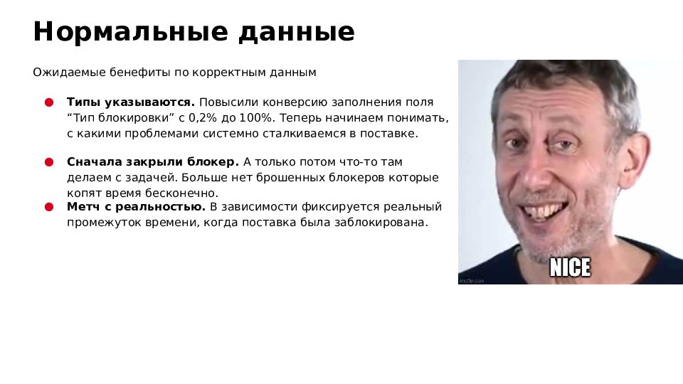 Типы указываются. Повысили конверсию заполнения поля “Тип блокировки” с 0,2% до 100%. Теперь начинаем понимать, с какими проблемами системно сталкиваемся в поставке. Сначала закрыли блокер. А только потом что-то там делаем с задачей. Больше нет брошенных блокеров которые копят время бесконечно. Ожидаемые бенефиты по корректным данным Метч с реальностью. В зависимости фиксируется реальный промежуток времени, когда поставка была заблокирована.