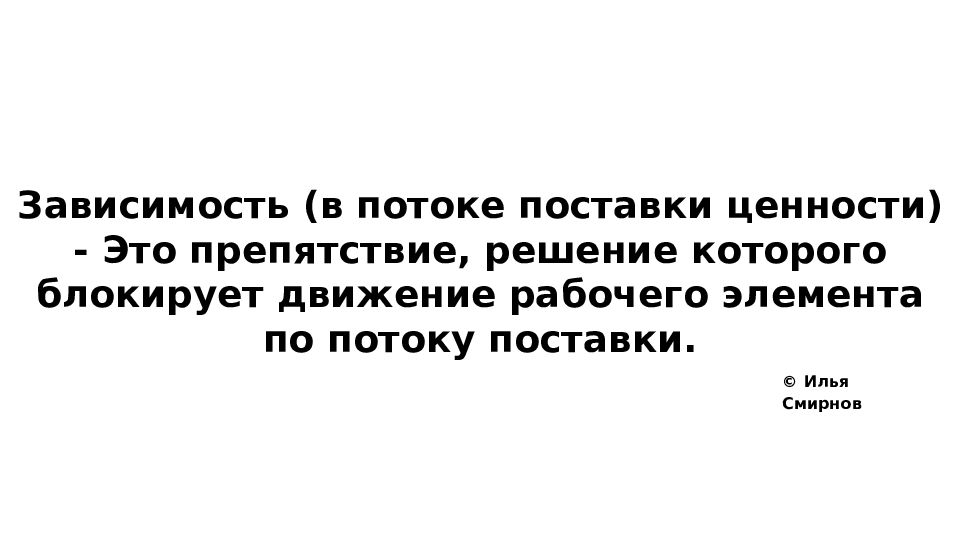 Слайд 6: Зависимость (в потоке поставки ценности) - Это препятствие, решение которого блокирует движение рабочего элемента по потоку поставки