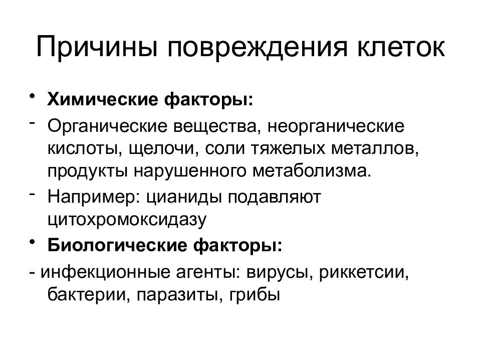 Химические факторы : Органические вещества, неорганические кислоты, щелочи, соли тяжелых металлов, продукты нарушенного метаболизма. Например : цианиды подавляют цитохромоксидазу Биологические факторы : - инфекционные агенты : вирусы, риккетсии, бактерии, паразиты, грибы